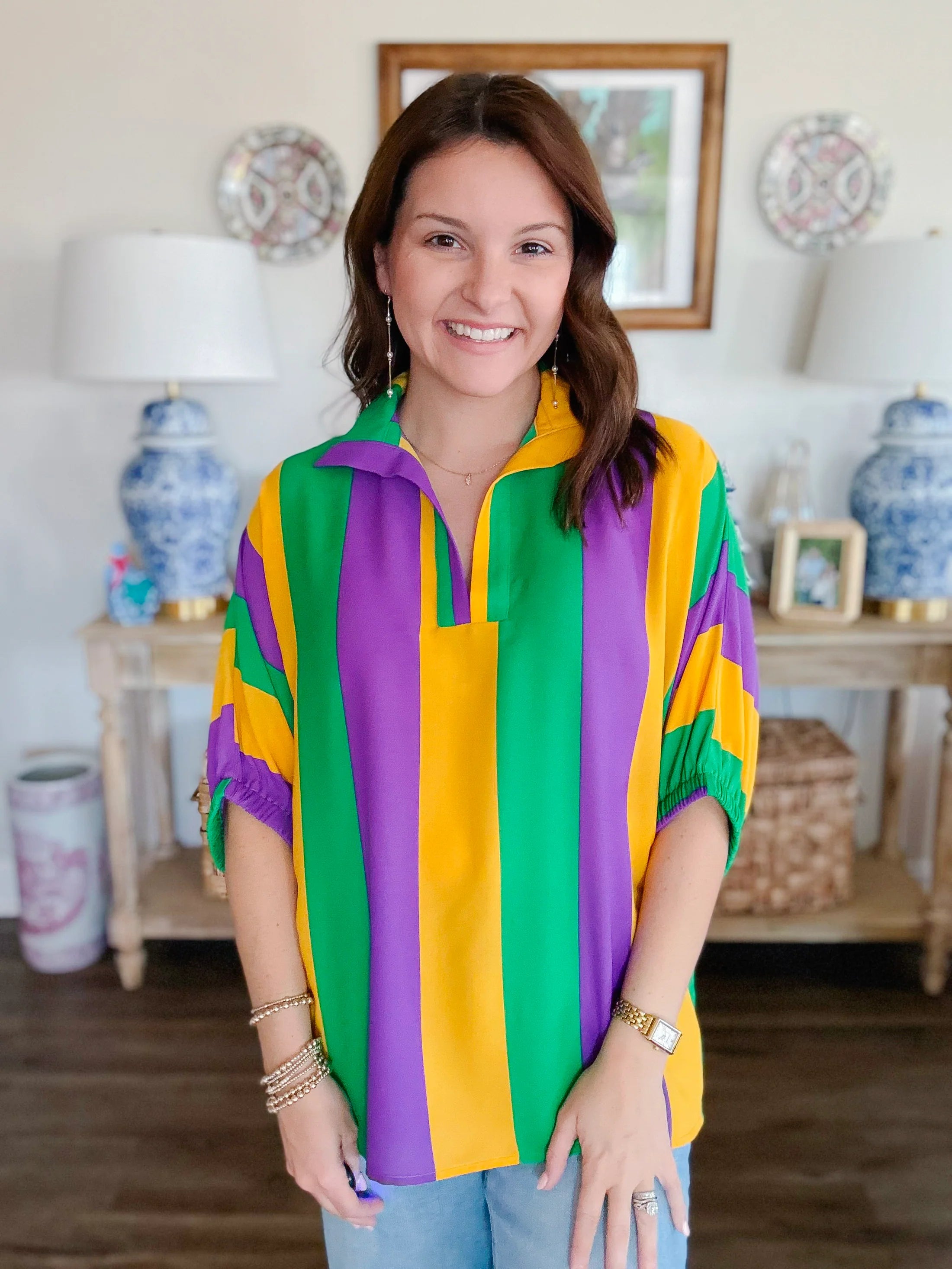 Sloan Mardi Gras Stripe Drop Shoulder Top (S-3XL)
