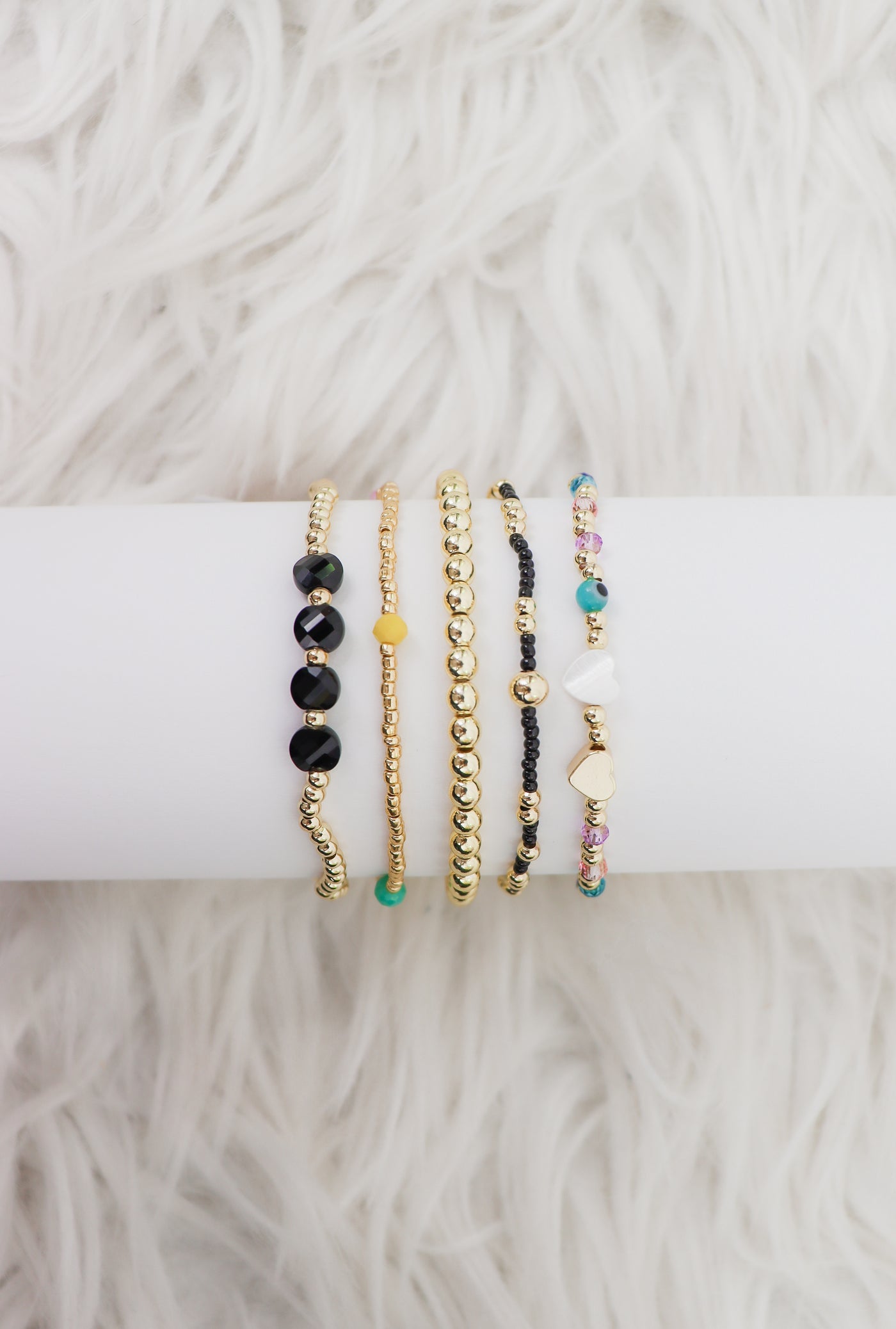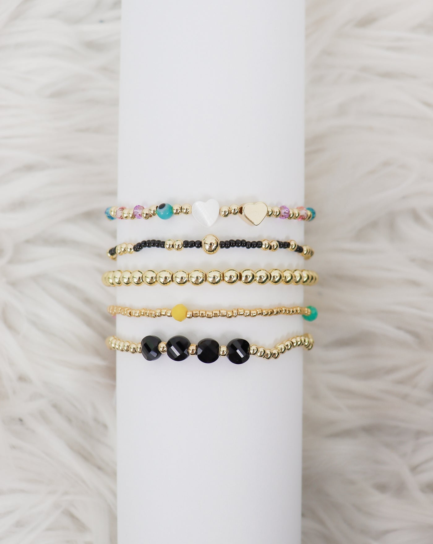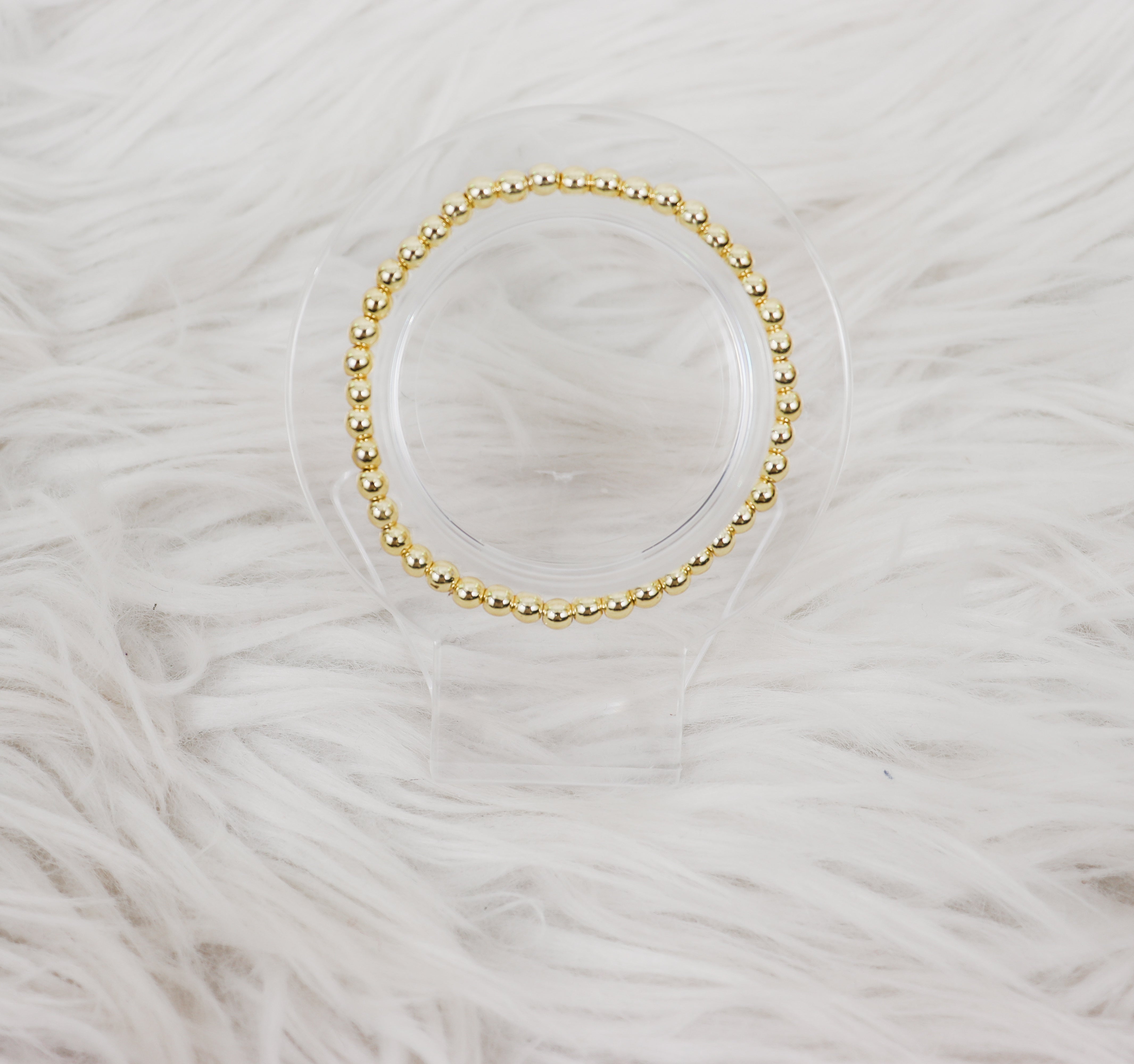 Meet your new favorite go-to accessory: The Goldie Beaded Bracelet. Featuring bold 4mm gold beads, this bracelet is the perfect size to make a statement without overwhelming your look. Its classic, sleek design makes it endlessly versatile—wear it solo for a simple, polished touch, stack multiple Goldies together for extra shine, or mix it with other styles like our Game Day Woven Bracelets for a playful, personalized stack.