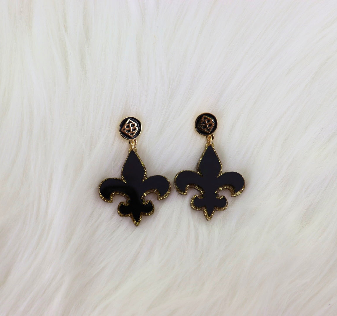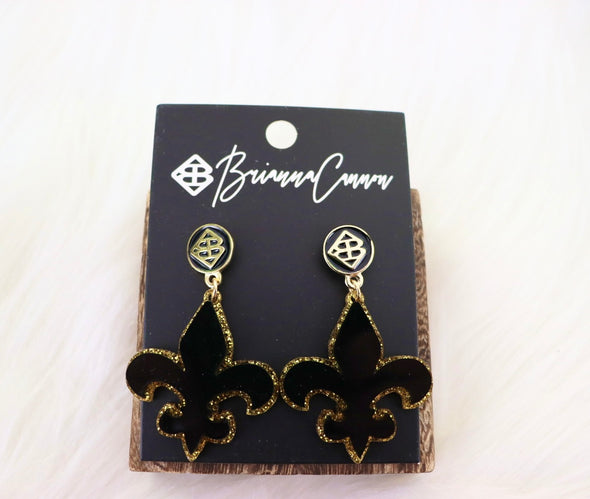Brianna Cannon Black and Gold Fleur De Lis Dangle Earrings