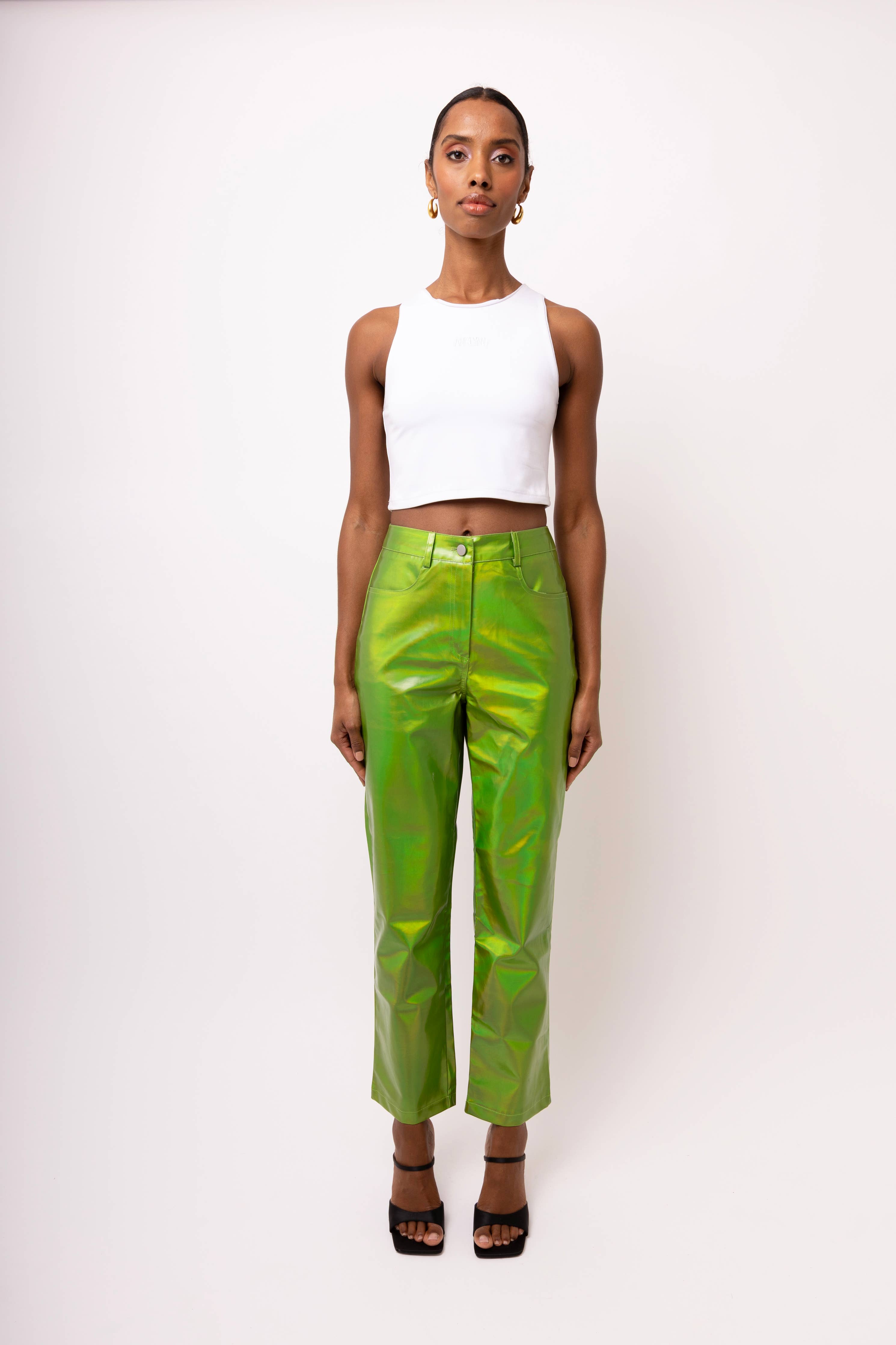 Green Metallic Mid Rise Straight Faux Leather Trousers