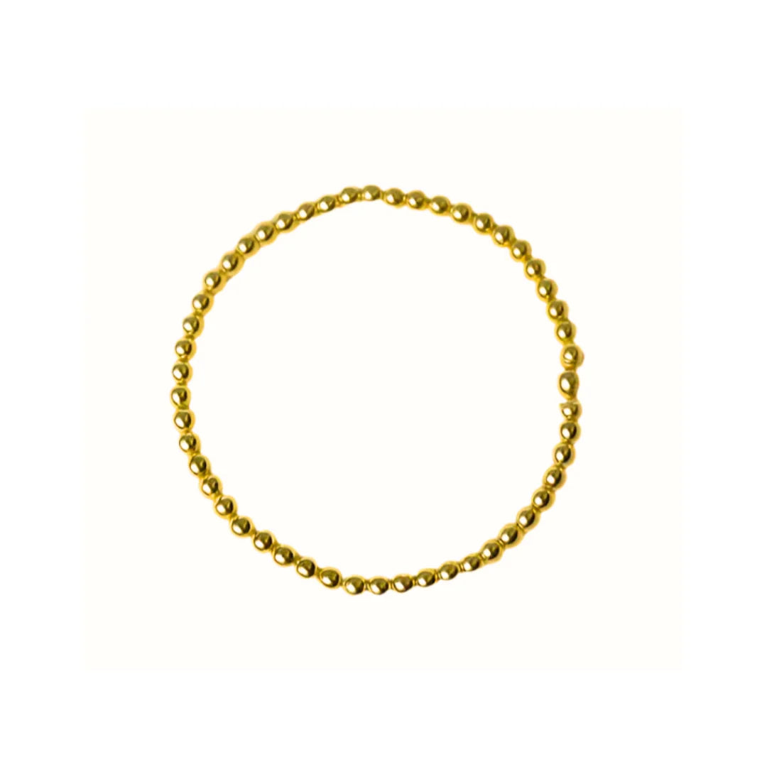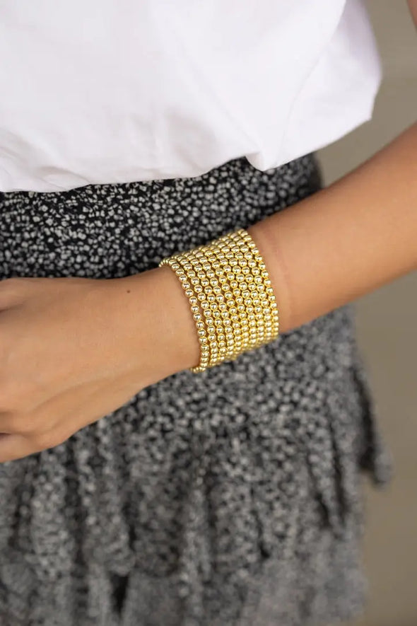 Meet your new favorite go-to accessory: The Goldie Beaded Bracelet. Featuring bold 4mm gold beads, this bracelet is the perfect size to make a statement without overwhelming your look. Its classic, sleek design makes it endlessly versatile—wear it solo for a simple, polished touch, stack multiple Goldies together for extra shine, or mix it with other styles like our Game Day Woven Bracelets for a playful, personalized stack.